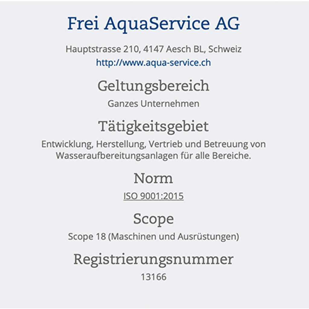 Gefertigt werden die Wasserenthärter mit viel Sorgfalt und nach hohen Qualitätsstandards in unserem Betrieb in der Schweiz – seit über 30 Jahren. Dabei werden konsequent hochwertige Materialien, vor allem wiederverwertbare Kunststoffe, sowie Bauteile von qualifizierten Lieferanten und Partnern verbaut. Die CO2-Bilanz wird laufend verbessert. Frei AquaService-Geräte sind langlebig und dauerhaft betriebssicher. Mehr als 15’000 Anwender geniessen bereits den zuverlässigen Komfort samtweichen Wassers – zu einem herausragenden Preis-Leistungs-Verhältnis. Unsere Fachhändler beraten kompetent, arbeiten professionell und bieten einen 24/7 Notfalldienst.